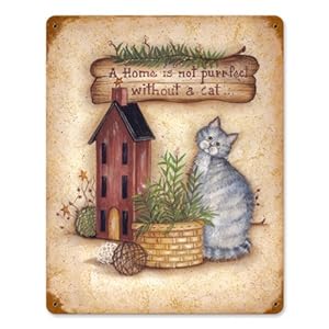 From the Penny Lane licensed collection, this Home with Cat vintage metal sign measures 11 inches by 14 inches and weighs in at 2 lb(s). This vintage metal sign is hand made in the USA using heavy gauge american steel and a process known as sublimation, where the image is baked into a powder coating for a durable and long lasting finish. It then undergoes a vintaging process by hand to give it an aged look and feel. This vintage metal sign is drilled and riveted for easy hanging.